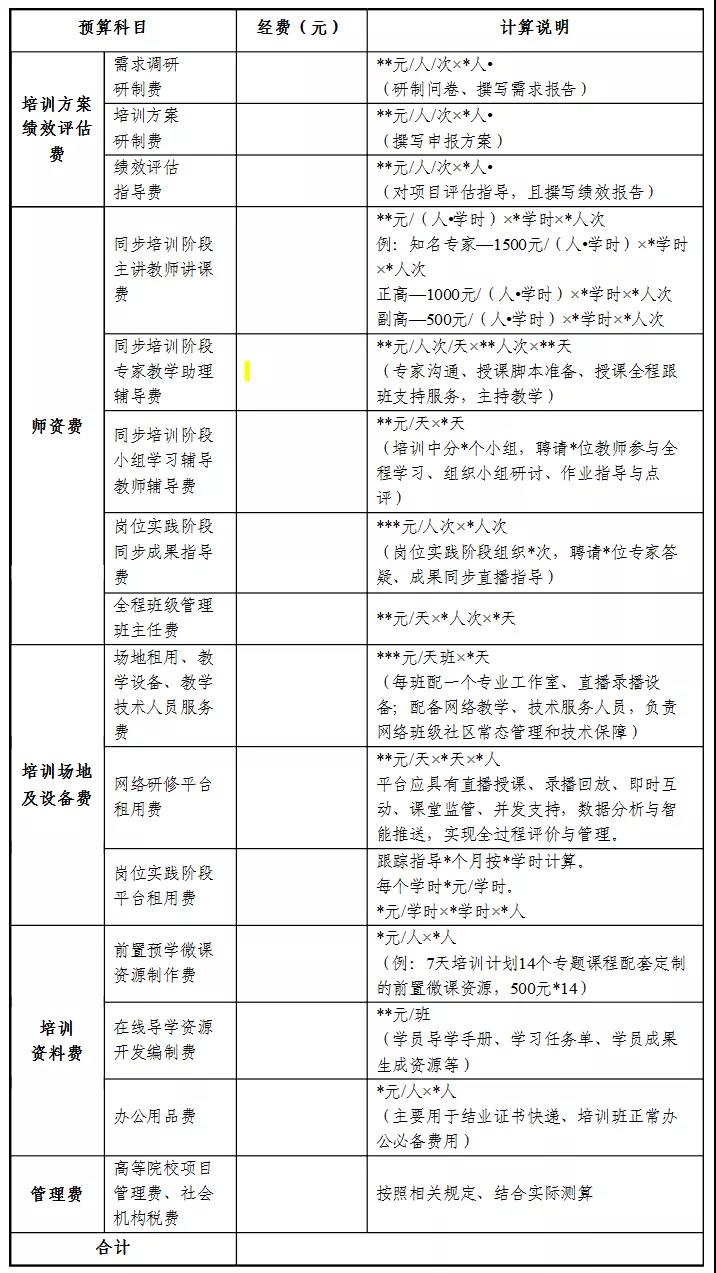 各省要依據(jù)教育部教師工作司、財務(wù)司關(guān)于印發(fā)《中小學(xué)幼兒園教師在線培訓(xùn)實(shí)施指南》的通知要求“經(jīng)費(fèi)成本包括師資成本、課程使用成本、流量成本、技術(shù)平臺成本、學(xué)習(xí)支持成本、組織管理成本、管理費(fèi)(稅費(fèi))成本等”。