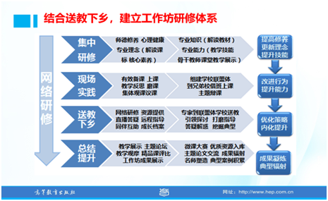 3. 結(jié)合送教下鄉(xiāng),建立工作坊研修體系--網(wǎng)絡(luò)研修、集中研修、現(xiàn)場實(shí)踐和送教下鄉(xiāng)相結(jié)合。