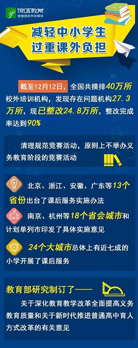 為推進綜合治理,教育部正會同有關(guān)部門研究制定中小學(xué)生綜合減負措施,明確各方責(zé)任,形成政府、學(xué)校、校外培訓(xùn)機構(gòu)、家庭協(xié)同推進減負工作合力。呂玉剛表示,下一步,要進一步加大校外培訓(xùn)機構(gòu)治理力度,切實解決校外培訓(xùn)機構(gòu)存在安全隱患、無證無照、超標(biāo)超前教學(xué)等突出問題,確保年底前完成集中整改工作。在此基礎(chǔ)上,強化督導(dǎo)檢查,鞏固治理成果,堅決防止反彈,建立健全校外培訓(xùn)機構(gòu)規(guī)范有序發(fā)展的長效機制,使校外培訓(xùn)走上制度化、規(guī)范化管理軌道,真正成為學(xué)校教育的有益補充,促進中小學(xué)生全面健康發(fā)展。