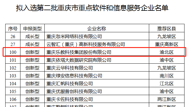 喜報l重慶樂教科技集團(tuán)入選“第二批重慶市重點軟件和信息服務(wù)企業(yè)名單”