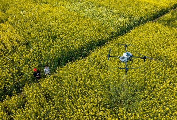 重慶南川區(qū)的油菜田上空一架無人機在駕駛員的操控下,忙碌地進行著飛防作業(yè)。無人機騰空而起,在油菜田上空按照預定路線勻速飛行,精準進行飛防作業(yè)。